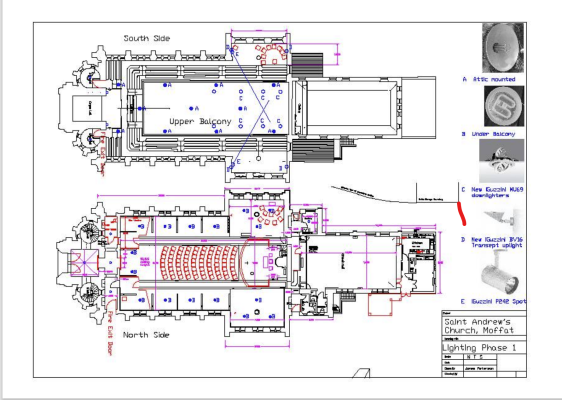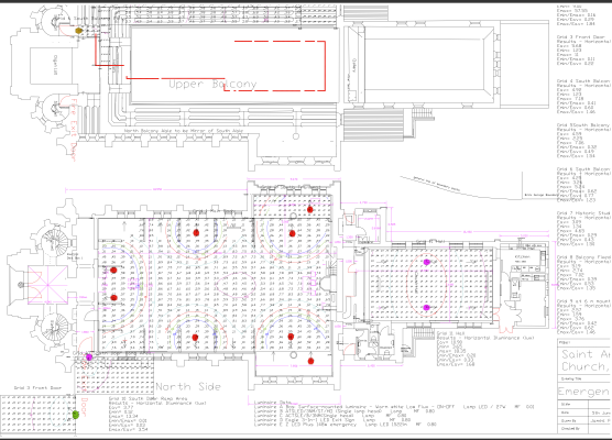 As a result, I produced a calculation showing that 5 or 6 of the under balcony units would meet the minimum illumination of 0.5 lux, in the main body of the church, if the existing iGuzzini discs were fitted with emergency backup packs.